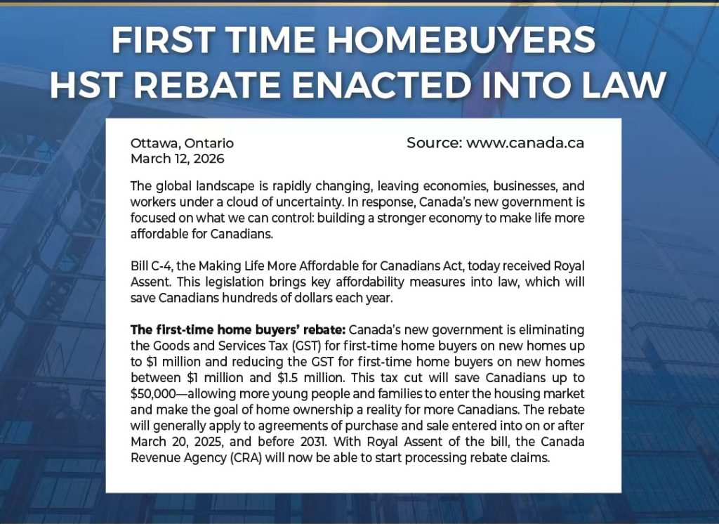 The first-time home buyers’ rebate: Canada’s new government is eliminating the Goods and Services Tax (GST) for first-time home buyers on new homes up to $1 million and reducing the GST for first-time home buyers on new homes between $1 million and $1.5 million. This tax cut will save Canadians up to $50,000—allowing more young people and families to enter the housing market and make the goal of home ownership a reality for more Canadians. The rebate will generally apply to agreements of purchase and sale entered into on or after March 20, 2025, and before 2031. With Royal Assent of the bill, the Canada Revenue Agency (CRA) will now be able to start processing rebate claims.